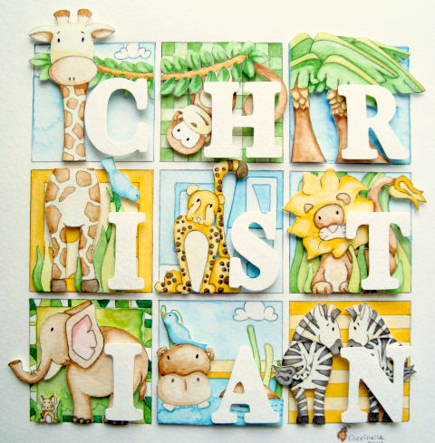 ‘CHRISTIAN’ – Original Watercolor June 2, 2014 | coccinelle Just finished up my sweet African Animals theme in a 9-square Original Watercolor for a baby boy “CHRISTIAN.” Possibly my favorite ever! Love how all the animals can interact in this format – Share this: Click to share on X (Opens in new window) X Click to share on Facebook (Opens in new window) Facebook Like Loading... Related