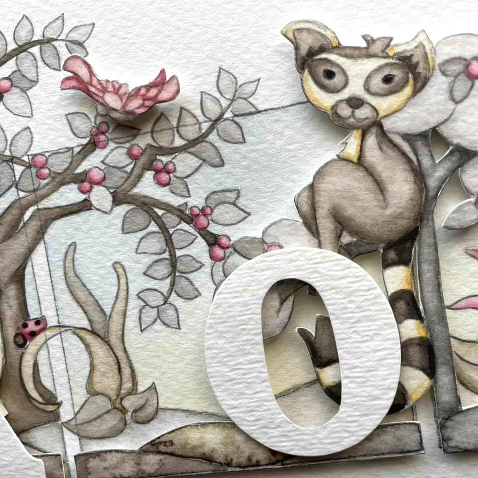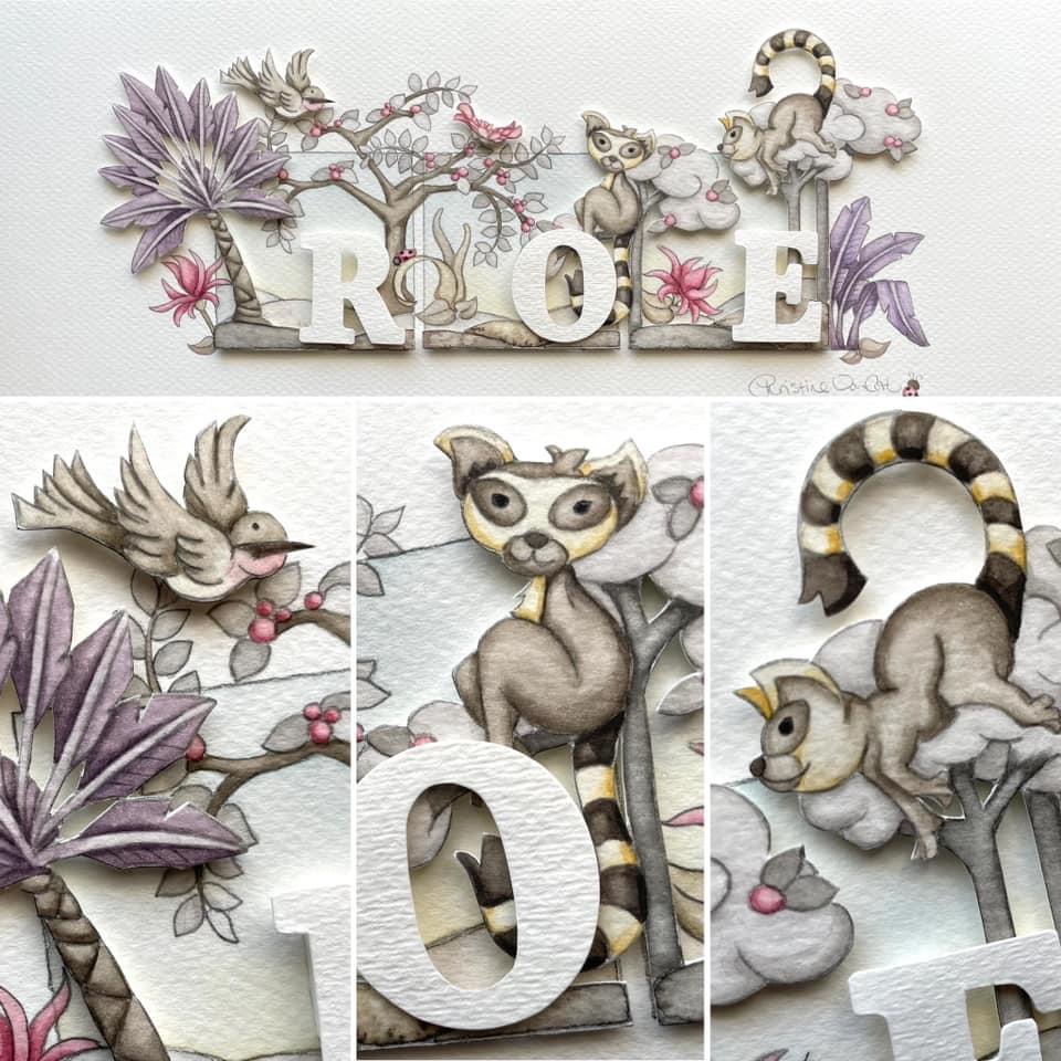 A dreamy, artsy name piece to match her room decor – with a travelers palm, exotic landscape and lemurs!