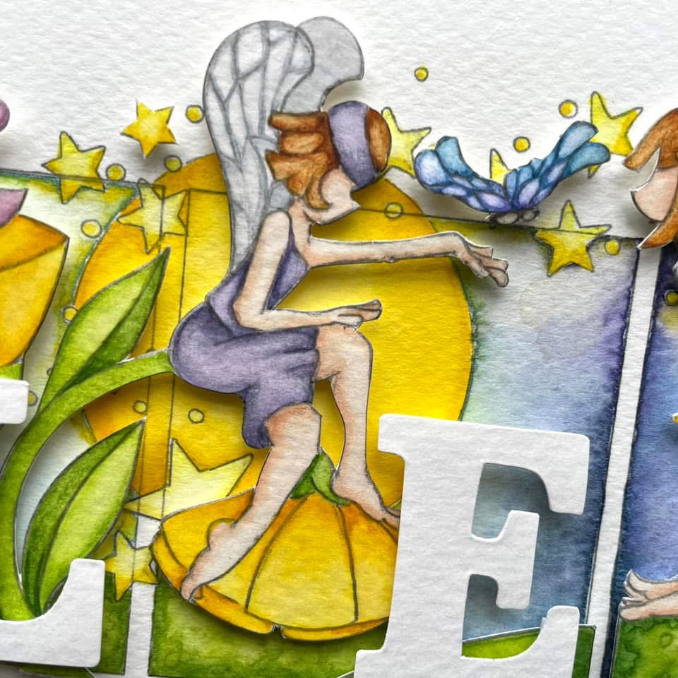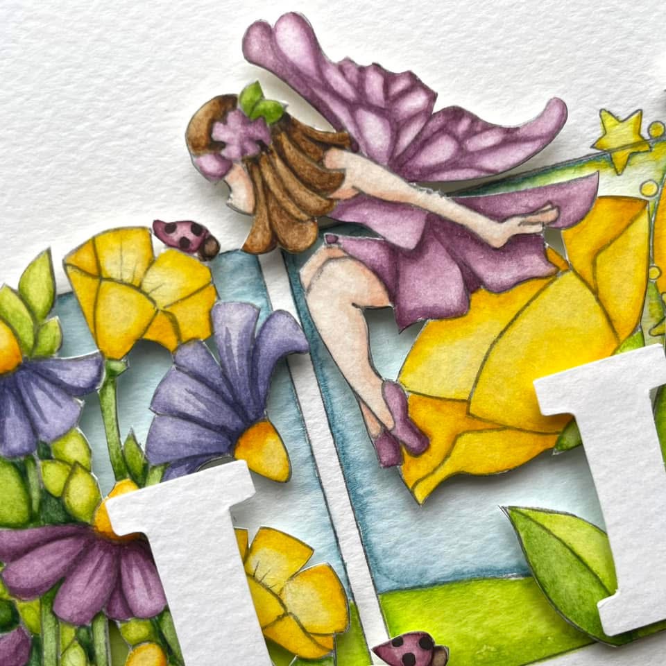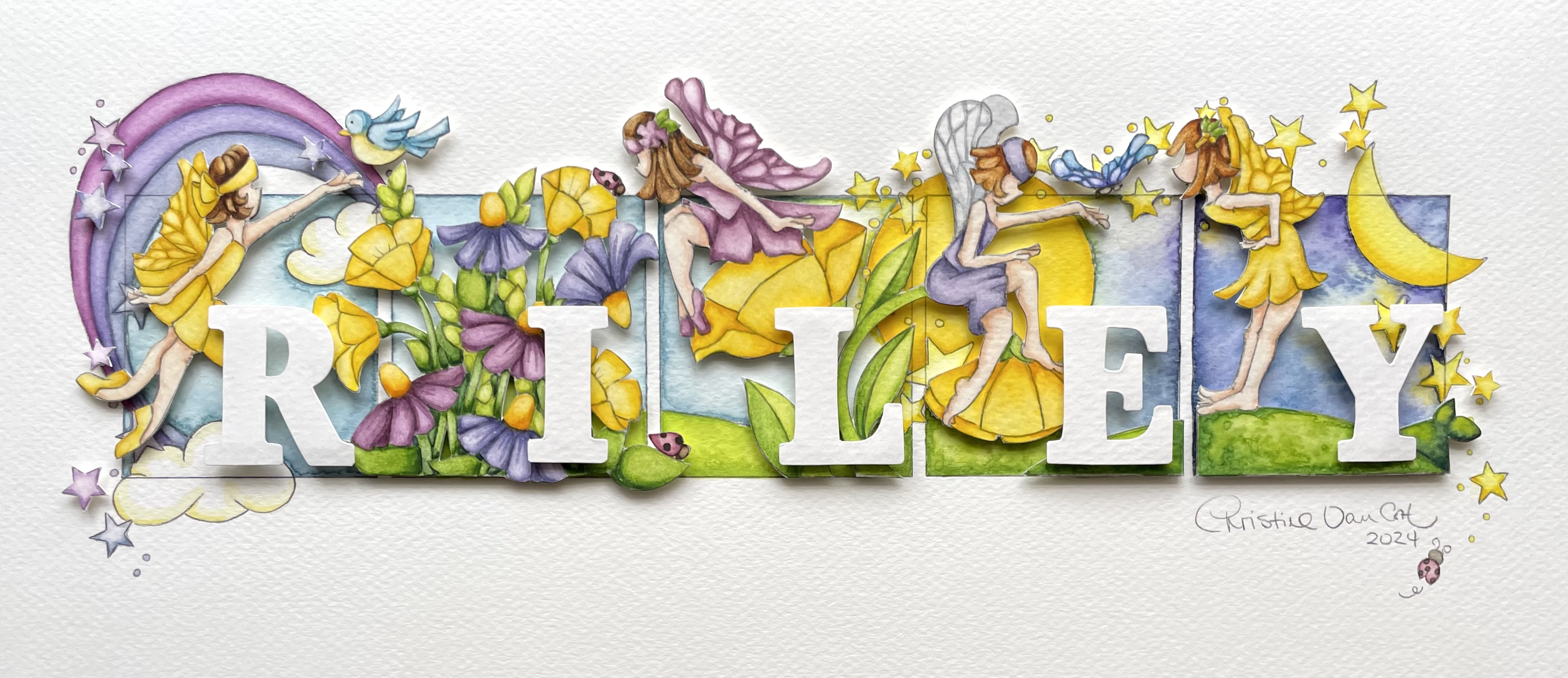 Curiosity & delight! It feels wonderful to share such a cheerful piece right now. Animated garden fairies in bright, sunshiny yellow and lilacs for a newborn girl.