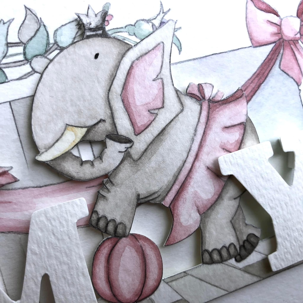 The sweetest kitten, ballerina & whimsical elephant, framed by flowing peonies and a delightful hummingbird. This piece specially matches their elegant nursery wallpaper –