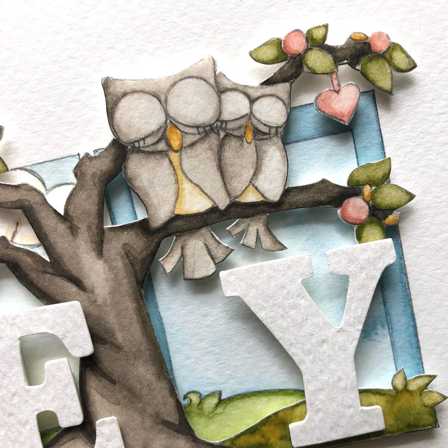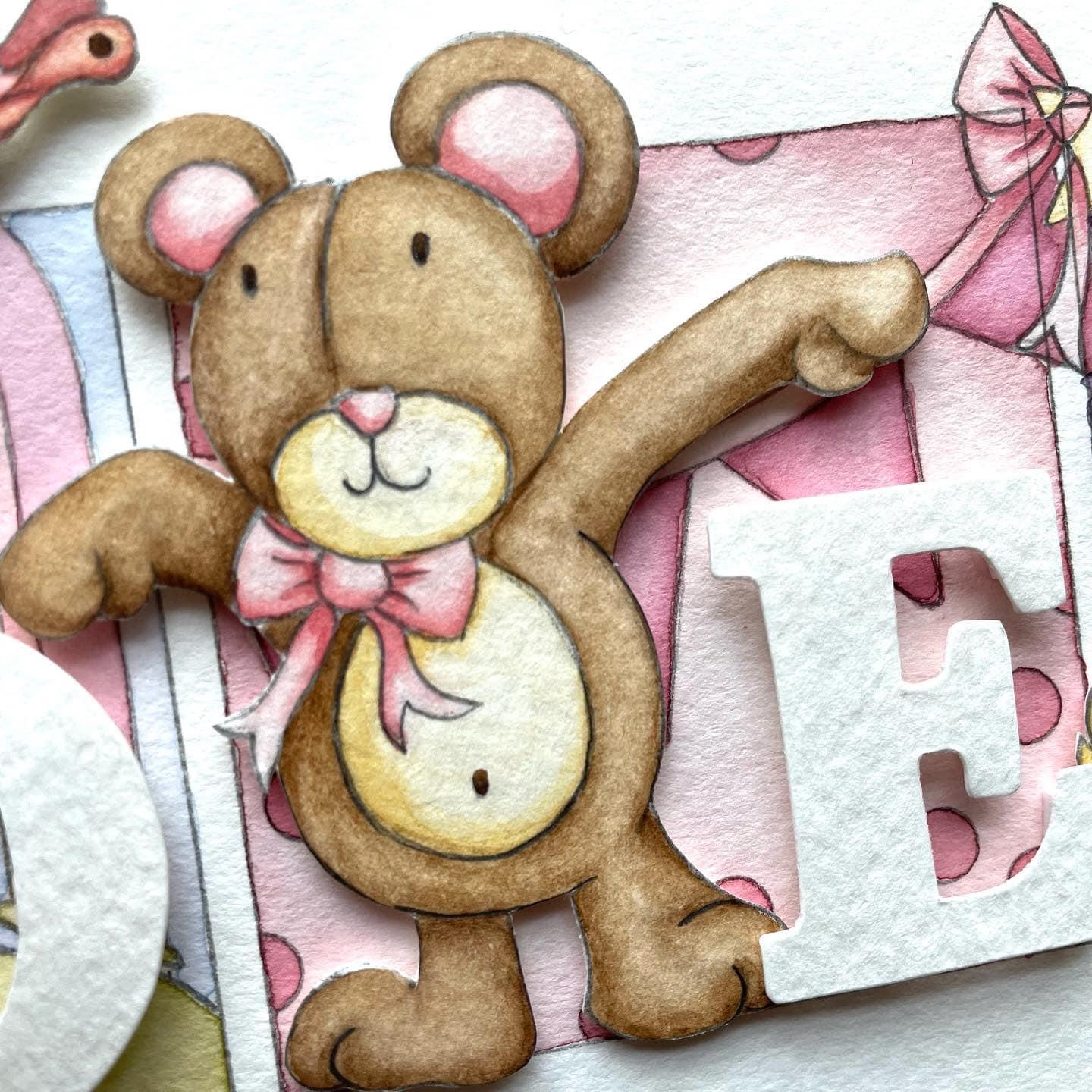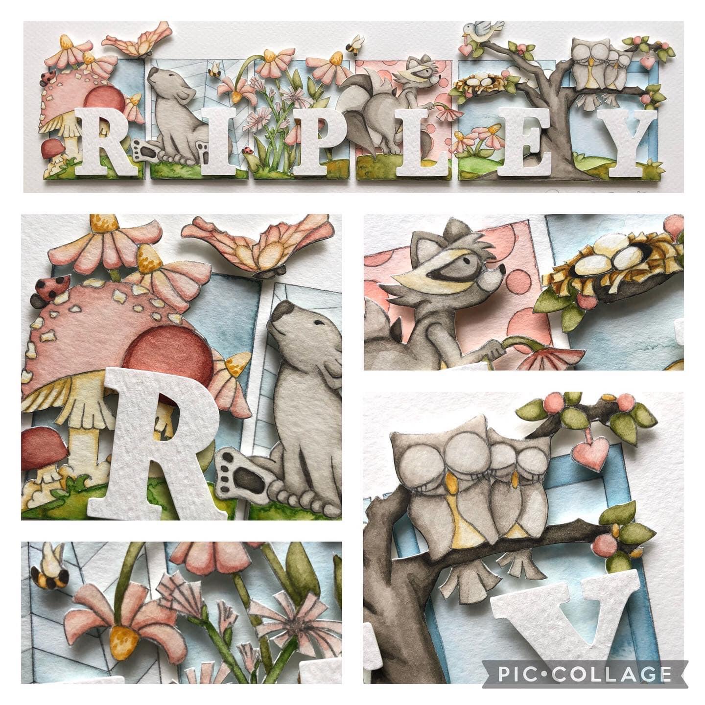 A playful bear, a curious raccoon & some cuddly, sleepy owls in sweet warm pinks and greys for a newborn girl.