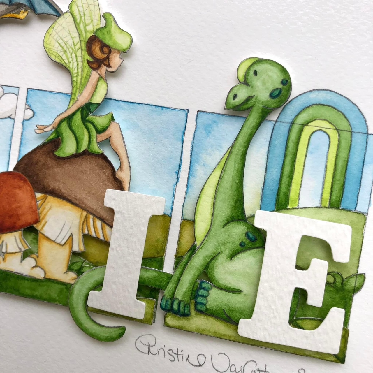 Sprites & fairies emerge from a woodland treehouse to fantastic rolling hills – complete with dinosaurs! There were so many tiny details in this lively, imaginative vision.