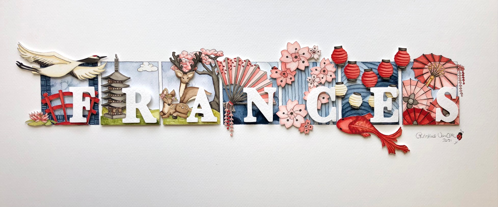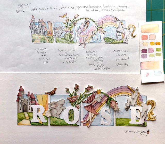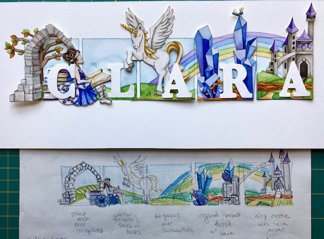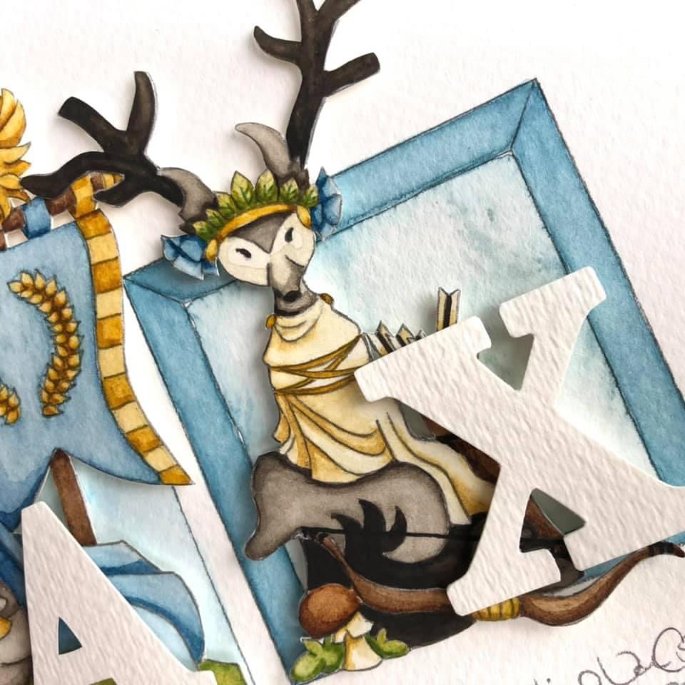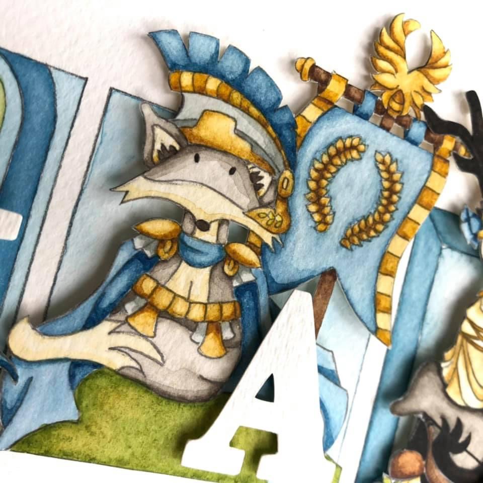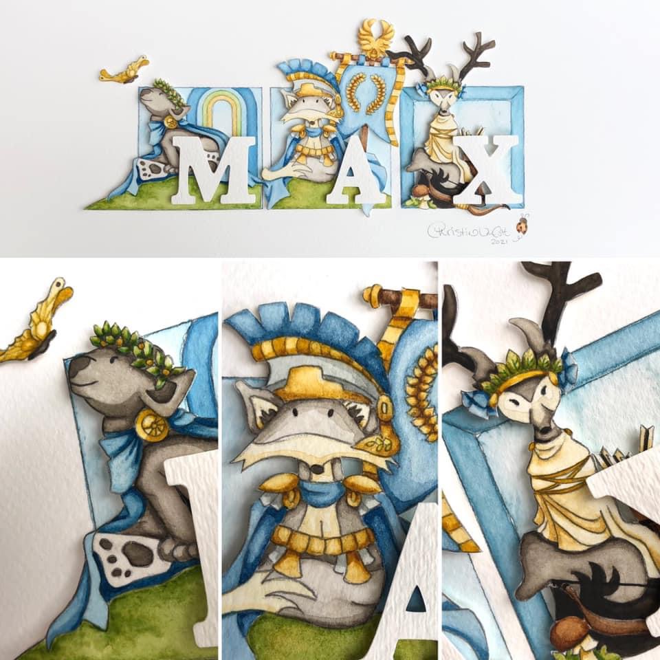 Max is for Maximus! A specially themed piece for a newborn with a regal name. Some of my all-time favorite woodland creatures in classical Roman/Greek style: with a toga, a warrior & Diana/Artemis with her bow and arrows.