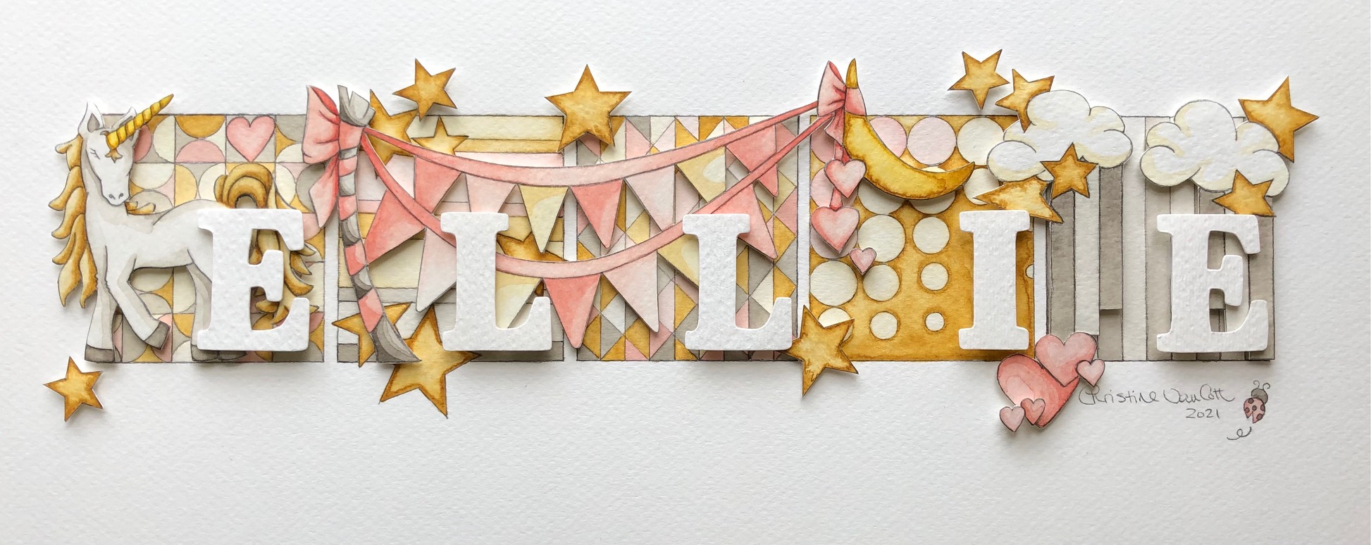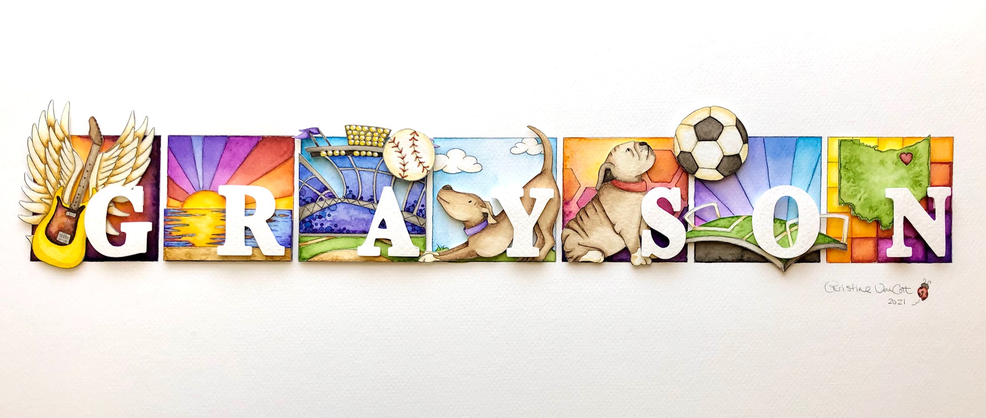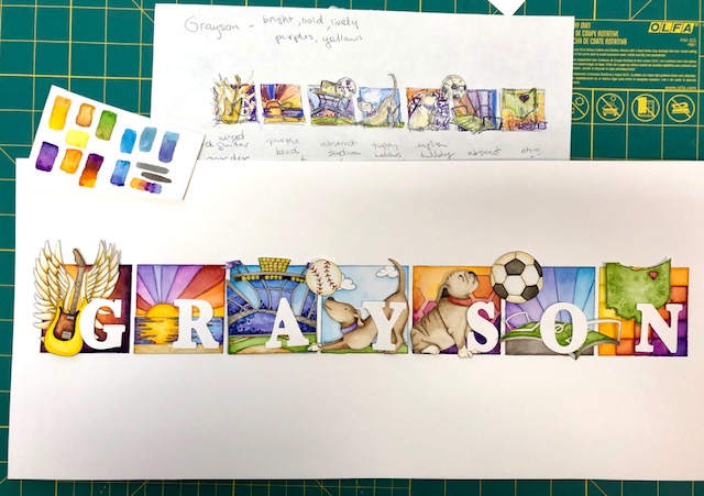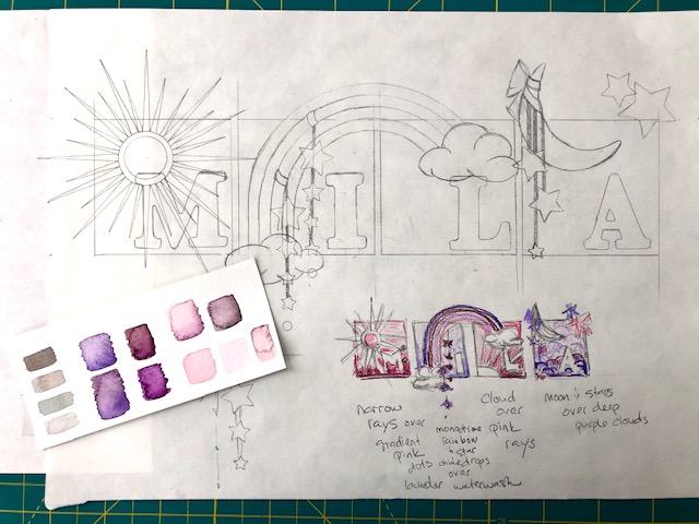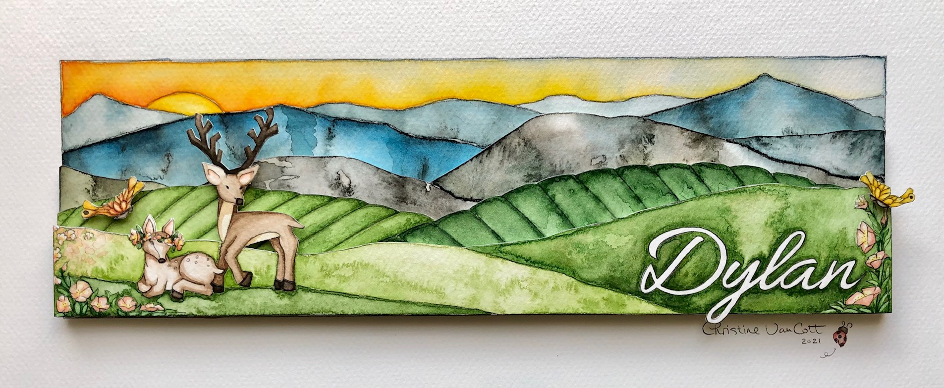 Creative challenge accepted! Recreate a sweet Blue Ridge Mountains theme for a newborn girl using the color palette of my lovely artist friend Heather Davis‘ work. This piece was created to coordinate with Heather’s encaustic work “Pompeii III” – see it here: https://www.heatherdavis.studio/shop/pompeii-series-iii-encaustic-painting/