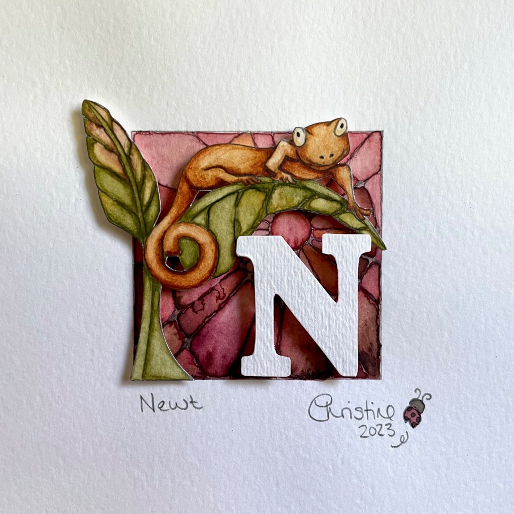 This curious newt was painted in layers, then hand-cut and hand-layered for a 3-dimensional effect.